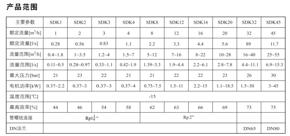 SDK16/SDKT16為配用標準電機的非自吸立式多級離心泵,電機軸和泵軸用聯軸器直接聯接的結構。為滿足水槽或容器的安裝深度,可安裝空套的腔體來改變泵本身的侵入 深度。